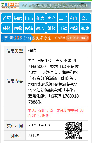 招加油员4名:男女不限制,月薪5000,要求年龄不超过40岁,身体健康,懂得和客户有良好的沟通,能吃苦,上24休24,可交养老保险。