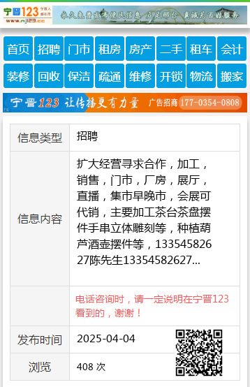 扩大经营寻求合作,加工,销售,门市,厂房,展厅,直播,集市早晚市,会展可代销,主要加工茶台茶盘摆件手串立体雕刻等,种植葫芦酒壶摆件等,13354582627陈先生13354582627 【电话咨询时,请一定说明在伊春信息网看到的,谢谢!】 |