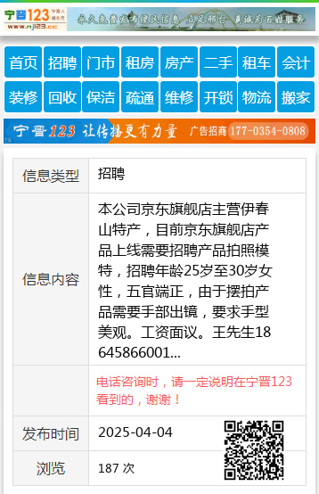本公司京东旗舰店主营伊春山特产,目前京东旗舰店产品上线需要招聘产品拍照模特,招聘年龄25岁至30岁女性,五官端正,由于摆拍产品需要手部出镜,要求手型美观。工资面议。王先生18645866001 【电话咨询时,请一定说明在伊春信息网看到的,谢谢!】 |
