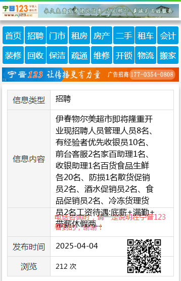 伊春物尔美超市即将隆重开业现招聘人员管理人员8名、有经验者优先收银员10名、前台客服2名家百助理1名、收银助理1名百货食品生鲜各20名、防损1名散货促销员2名、酒水促销员2名、食品促销员2名、冷冻货理货员2名工资待遇:底薪+满勤+带薪休假两天待遇优厚,环境很好,工作很轻松愉快,期待您的加入另外招聘短期收银员、促销员工资日算地址:二百货原高山超市联系电话☎13234588292魏女士13304583248 【电话咨询时,请一定说明在伊春信息网看到的,谢谢!】 |
