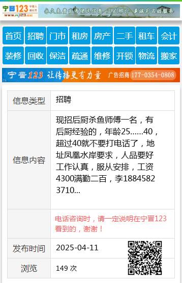 现招后厨杀鱼师傅一名,有后厨经验的,年龄25……40,超过40就不要打电话了,地址凤凰水岸要求,人品要好工作认真,服从安排,工资4300满勤二百,李18845823710