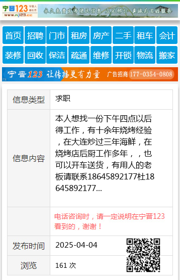 本人想找一份下午四点以后得工作,有十余年烧烤经验,在大连炒过三年海鲜,在烧烤店后厨工作多年,,也可以开车送货,有用人的老板请联系18645892177杜18645892177