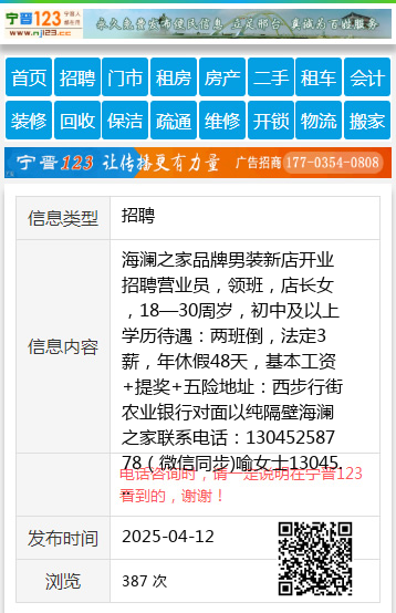 海澜之家品牌男装新店开业招聘营业员,领班,店长女,18—30周岁,初中及以上学历待遇:两班倒,法定3薪,年休假48天,基本工资+提奖+五险地址:西步行街农业银行对面以纯隔壁海澜之家联系电话:13045258778(微信同步)喻女士13045258778 【电话咨询时,请一定说明在伊春信息网看到的,谢谢!】 |