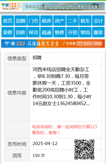 河西米线店招聘全天勤杂工,早8.30到晚7.30,每月带薪休假一天,工资3500,全勤奖200或招聘小时工,工作时间10.30到1.30,每小时14元赵女士13624580452 【电话咨询时,请一定说明在伊春信息网看到的,谢谢!】 |