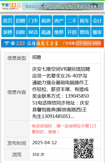 庆安七维空间VR潮玩馆招聘店员一名要求女26-40岁沟通能力强会基础电脑操作工作轻松、薪资丰厚、有提成奖金联系方式:13904585051电话微信同步地址:庆安县馨悦雅典(解放南路西)王先生13091485051