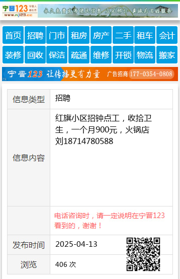 红旗小区招钟点工,收拾卫生,一个月900元,火锅店刘18714780588