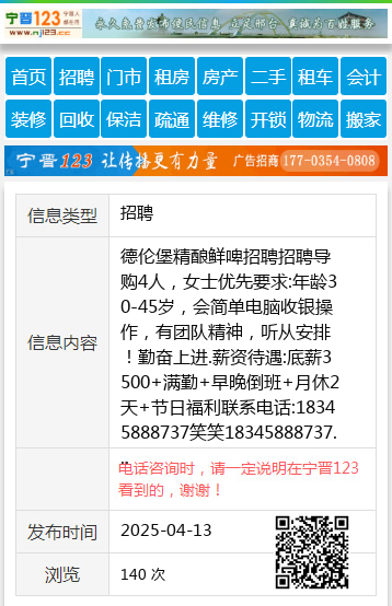 德伦堡精酿鲜啤招聘招聘导购4人,女士优先要求:年龄30-45岁,会简单电脑收银操作,有团队精神,听从安排!勤奋上进.薪资待遇:底薪3500+满勤+早晚倒班+月休2天+节日福利联系电话:18345888737笑笑18345888737