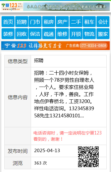 招聘:二十四小时女保姆,照顾一个78岁男性自理老人,一个人。要求家住林业局,人好,干净,善良。工作地点伊春桥北,工资3200。祥性电话咨询。13234583958先生13214580101 【电话咨询时,请一定说明在伊春信息网看到的,谢谢!】 |