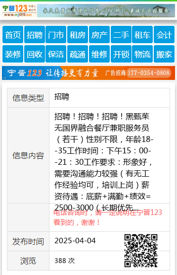 招聘!招聘!招聘!黑甄茱无国界融合餐厅兼职服务员(若干)性别不限,年龄18--35工作时间:下午15:00--21:30工作要求:形象好,需要沟通能力较强(有无工作经验均可,培训上岗)薪资待遇:底薪+满勤+绩效=2500-3000(长期优先)福利待遇:每半年底薪上浮50+满一年缴纳养老保险+员工生日红包+优秀员工奖+年底奖金注:工作量不大,是正常餐饮店工作量的三分之一,对客服务标准要求较高金女士17645597576 【电话咨询时,请一定说明在伊春信息网看到的,谢谢!】 |