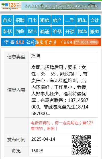 寿司店招聘后厨,要求:女性,35—55,能长期干,有责任心,有无经验均可。店内环境好,工作量小,老板人好事儿还少。福利待遇优厚,有意者联系:18714587000。非诚勿扰董先生18714587000 【电话咨询时,请一定说明在伊春信息网看到的,谢谢!】 |