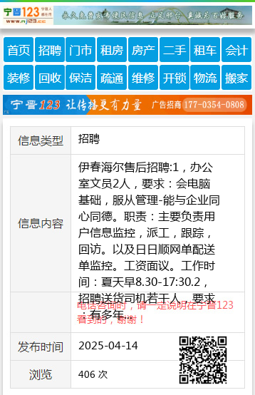 伊春海尔售后招聘:1,办公室文员2人,要求:会电脑基础,服从管理-能与企业同心同德。职责:主要负责用户信息监控,派工,跟踪,回访。以及日日顺网单配送单监控。工资面议。工作时间:夏天早8.30-17:30.2,招聘送货司机若干人,要求:有多年驾驶货车经验,独立基础维护车辆。服从管理,按要求完成每日任务。职责:负责家电配送,带货安装。工作时间无限制,以时效完成率为准。工资:月入5000-8000元3,家电安装维修服务兵若干人。有经验者直接考证入岗。无经验,可免费培训后考证入岗。工作时间:无限制已服务用户为主。工资:月入5000-8000元(不算空调旺季,具体面谈)公司:黑龙江德允商贸有限公司(伊春海尔售后)负责人:周经理电话16536402222电话18645871444周经理18645871444 【电话咨询时,请一定说明在伊春信息网看到的,谢谢!】 |