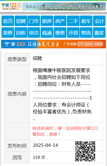 根据博康中医医院发展要求,现面向社会招聘如下岗位:招聘岗位:财务人员------------------------------------------------------------1人岗位要求:有会计师证(经验丰富者优先),负责财务部门的各项事务招聘岗位:药剂师----------------------------------------------------------------2人岗位要求:有职业药师证(含中药学),负责药局管理工作、日常售药工作招聘岗位:护士长--------------------------------------------------------------1人岗位要求:护理专业工作经验10年以上,负责护理管理工作招聘岗位:护士-------------------------------------------------------------------8人岗位要求:护理专业,负责日常护理工作招聘岗位:康复师----------------------------------------------------------------8人岗位要求:从事康复行业1年以上,对患者进行康复招聘岗位:针灸师---------------------------------------------------------------2人岗位要求:从事针灸3年以上,对患者进行针灸招聘岗位:医师助理------------------------------------------------------------5人岗位要求:有助理医师证(针灸专业优先),辅助医师进行患者日常管理招聘岗位:彩超师---------------------------------------------------------------1人岗位要求:有检验技师证(经验丰富者优先),从事检验相关工作招聘岗位:更夫-------------------------------------------------------------------1人岗位要求:无要求,夜间值班王女士18704588778 【电话咨询时,请一定说明在伊春信息网看到的,谢谢!】 |
