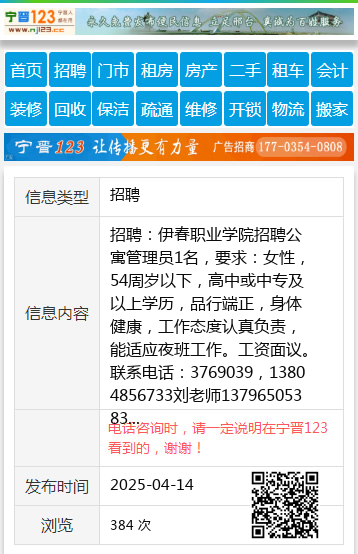 招聘:伊春职业学院招聘公寓管理员1名,要求:女性,54周岁以下,高中或中专及以上学历,品行端正,身体健康,工作态度认真负责,能适应夜班工作。工资面议。联系电话:3769039,13804856733刘老师13796505383 【电话咨询时,请一定说明在伊春信息网看到的,谢谢!】 |