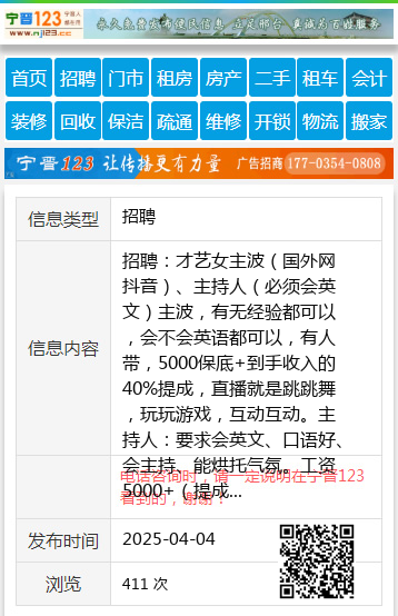 招聘:才艺女主波(国外网抖音)、主持人(必须会英文)主波,有无经验都可以,会不会英语都可以,有人带,5000保底+到手收入的40%提成,直播就是跳跳舞,玩玩游戏,互动互动。主持人:要求会英文、口语好、会主持、能烘托气氛。工资5000+(提成10%-20%)工作时间:上午9点-12点下午14点到18点调休4天年龄35岁以内,工资待遇会根据业绩适当调整,月入1-2万不是问题,圆圆13089618500 【电话咨询时,请一定说明在伊春信息网看到的,谢谢!】 |