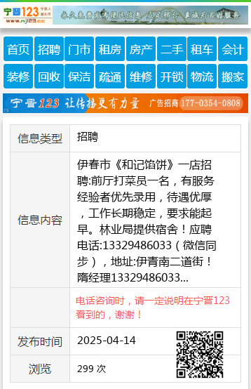 伊春市《和记馅饼》一店招聘:前厅打菜员一名,有服务经验者优先录用,待遇优厚,工作长期稳定,要求能起早。林业局提供宿舍!应聘电话:13329486033(微信同步),地址:伊青南二道街!隋经理13329486033 【电话咨询时,请一定说明在伊春信息网看到的,谢谢!】 |