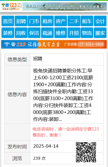 极兔快递招聘兼职分拣工:早上6:00-12:00工资2100(底薪1900+200满勤)工作内容:分拣扫描快件全职内勤:工资3300(底薪3100+200满勤)工作内容:分扫快件装卸工:工资4000(底薪3800+200满勤)工作内容:装卸快件驿站司机:C证即可工资4000(底薪3800+200满勤)工作内容:送驿站及分拣扫描快件林业局司机:B证司机工资4000(底薪3800+200勤)快递员:1元每件一般150-200件左右发货提成高公司提供三轮车要求:无重大疾病脑梗心梗心脏病等工作地点:七公里辽西物流西侧,水岸公馆南环红绿灯新峰建筑材料公司院内。联系电话:15846585657/13039682456徐经理13039682456 【电话咨询时,请一定说明在伊春信息网看到的,谢谢!】 |