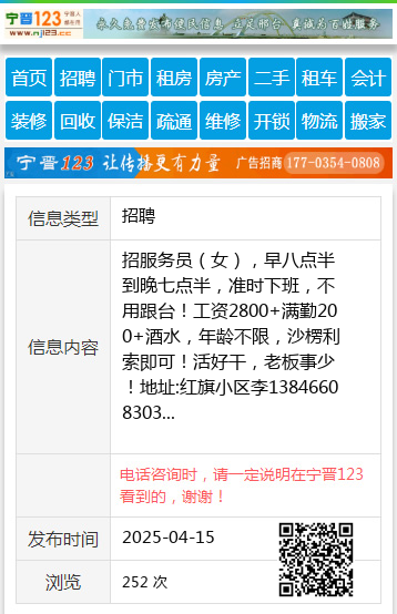 招服务员(女),早八点半到晚七点半,准时下班,不用跟台!工资2800+满勤200+酒水,年龄不限,沙楞利索即可!活好干,老板事少!地址:红旗小区李13846608303 【电话咨询时,请一定说明在伊春信息网看到的,谢谢!】 |