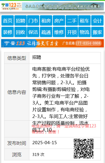 电商客服:有电商平台经验优先,打字快,处理各平台日常销售问题,2-3人。拍摄剪辑:有摄影剪辑经验,对电子商务行业有一定了解,2-3人。美工:电商平台产品图片设置制作,有电商经验,2-3人。车间工人:主管做好生产过程的质量控制,流水线工人10人。以上岗位工资面议。王女士18645877878