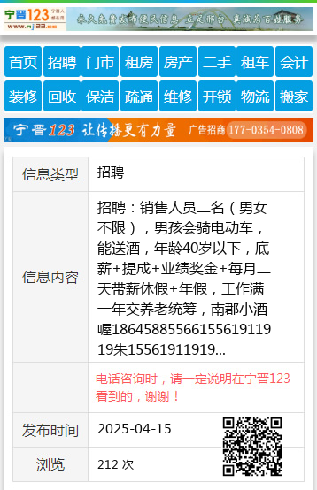 招聘:销售人员二名(男女不限),男孩会骑电动车,能送酒,年龄40岁以下,底薪+提成+业绩奖金+每月二天带薪休假+年假,工作满一年交养老统筹,南郡小酒喔1864588556615561911919朱15561911919 【电话咨询时,请一定说明在伊春信息网看到的,谢谢!】 |