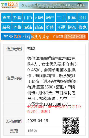 德伦堡精酿鲜啤招聘招聘导购4人,女士优先要求:年龄30-45岁,会简单电脑收银操作,有团队精神,听从安排!勤奋上进.有销售经验薪资待遇:底薪3500+满勤+早晚倒班+月休2天+节日福利乌马河,松韵新城,八中,二百货笑笑18345888737 【电话咨询时,请一定说明在伊春信息网看到的,谢谢!】 |