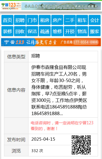 伊春市森隆食品有限公司现招聘车间生产工人20名,男女不限,年龄30-50之间,身体健康,吃苦耐劳,听从指挥,早7点至晚5点半,薪资3000元,工作地点伊美区联系电话18645891888陶总18645891888 【电话咨询时,请一定说明在伊春信息网看到的,谢谢!】 |