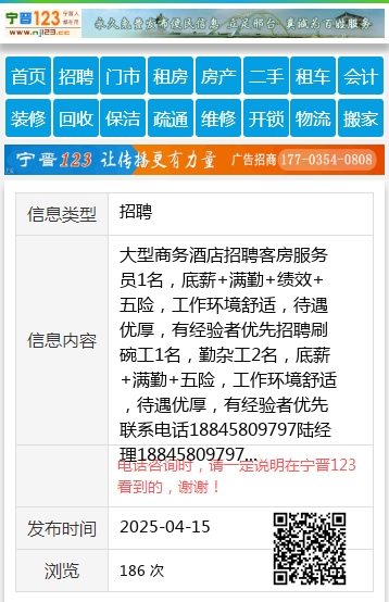 大型商务酒店招聘客房服务员1名,底薪+满勤+绩效+五险,工作环境舒适,待遇优厚,有经验者优先招聘刷碗工1名,勤杂工2名,底薪+满勤+五险,工作环境舒适,待遇优厚,有经验者优先联系电话18845809797陆经理18845809797 【电话咨询时,请一定说明在伊春信息网看到的,谢谢!】 |