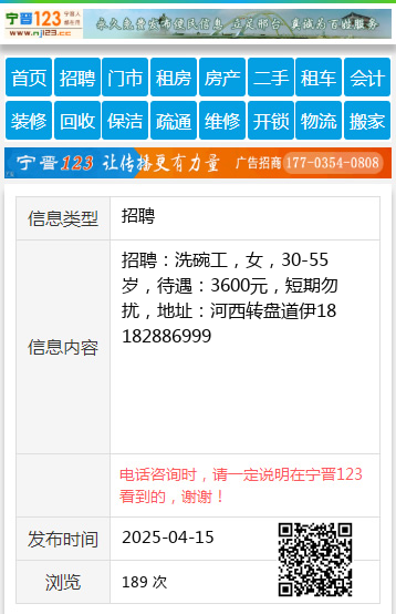 招聘:洗碗工,女,30-55岁,待遇:3600元,短期勿扰,地址:河西转盘道伊18182886999