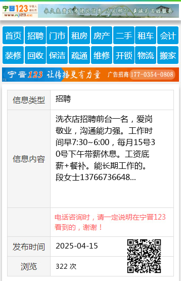 洗衣店招聘前台一名,爱岗敬业,沟通能力强。工作时间早7:30~6:00,每月15号30号下午带薪休息。工资底薪+餐补。能长期工作的。段女士13766736648 【电话咨询时,请一定说明在伊春信息网看到的,谢谢!】 |