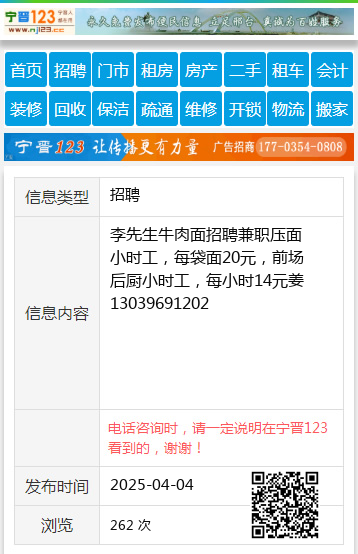 李先生牛肉面招聘兼职压面小时工,每袋面20元,前场后厨小时工,每小时14元姜13039691202