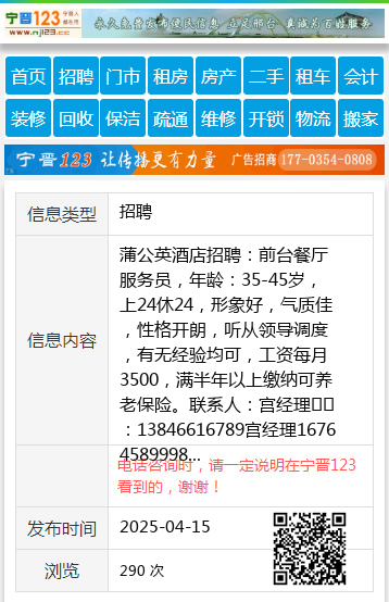 蒲公英酒店招聘:前台餐厅服务员,年龄:35-45岁,上24休24,形象好,气质佳,性格开朗,听从领导调度,有无经验均可,工资每月3500,满半年以上缴纳可养老保险。联系人:宫经理☎️:13846616789宫经理16764589998 【电话咨询时,请一定说明在伊春信息网看到的,谢谢!】 |