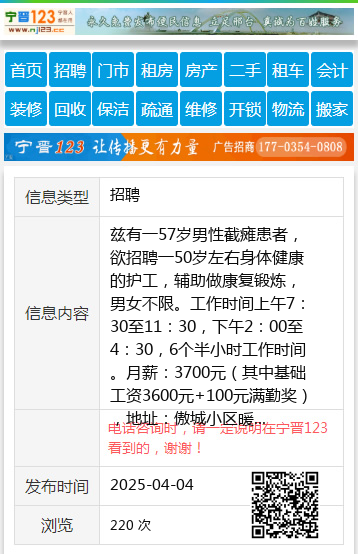 兹有一57岁男性截瘫患者,欲招聘一50岁左右身体健康的护工,辅助做康复锻炼,男女不限。工作时间上午7:30至11:30,下午2:00至4:30,6个半小时工作时间。月薪:3700元(其中基础工资3600元+100元满勤奖),地址:傲城小区暖阳13194583030 【电话咨询时,请一定说明在伊春信息网看到的,谢谢!】 |
