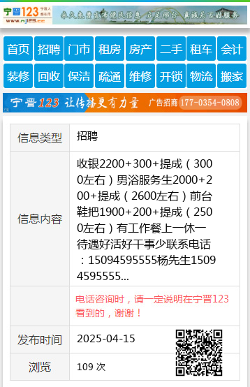 收银2200+300+提成(3000左右)男浴服务生2000+200+提成(2600左右)前台鞋把1900+200+提成(2500左右)有工作餐上一休一待遇好活好干事少联系电话:15094595555杨先生15094595555 【电话咨询时,请一定说明在伊春信息网看到的,谢谢!】 |