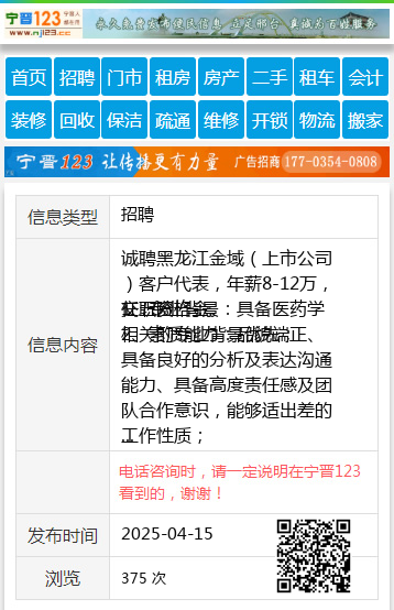 诚聘黑龙江金域(上市公司)客户代表,年薪8-12万,交五险一金。