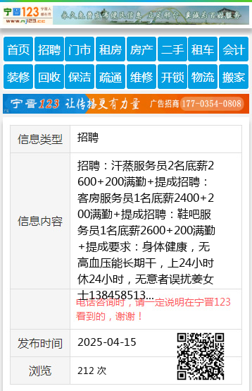 招聘:汗蒸服务员2名底薪2600+200满勤+提成招聘:客房服务员1名底薪2400+200满勤+提成招聘:鞋吧服务员1名底薪2600+200满勤+提成要求:身体健康,无高血压能长期干,上24小时休24小时,无意者误扰姜女士13845851380 【电话咨询时,请一定说明在伊春信息网看到的,谢谢!】 |