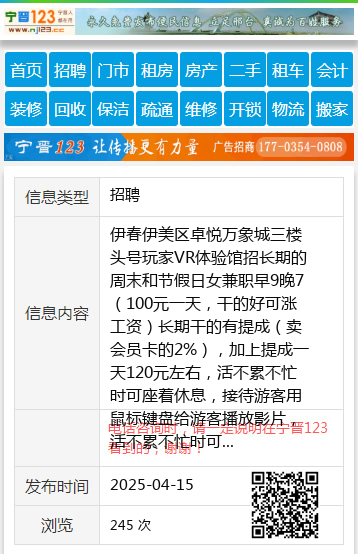 伊春伊美区卓悦万象城三楼头号玩家VR体验馆招长期的周末和节假日女兼职早9晚7(100元一天,干的好可涨工资)长期干的有提成(卖会员卡的2%),加上提成一天120元左右,活不累不忙时可座着休息,接待游客用鼠标键盘给游客播放影片,活不累不忙时可座着休息另招女假期工底薪2000+提成(每个月2500元+)杨先生18804644777