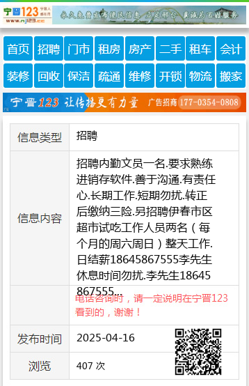 招聘内勤文员一名.要求熟练进销存软件.善于沟通.有责任心.长期工作.短期勿扰.转正后缴纳三险.另招聘伊春市区超市试吃工作人员两名(每个月的周六周日)整天工作.日结薪18645867555李先生休息时间勿扰.李先生18645867555 【电话咨询时,请一定说明在伊春信息网看到的,谢谢!】 |