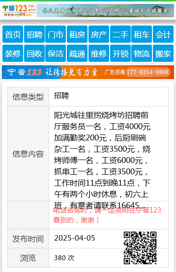 阳光城往里拐烧烤坊招聘前厅服务员一名,工资4000元加满勤奖200元,后厨刷碗杂工一名,工资3500元,烧烤师傅一名,工资6000元,抓串工一名,工资3500元,工作时间11点到晚11点,下午有两个小时休息,初六上班,有意者请联系16645381313王先生16645381313 【电话咨询时,请一定说明在伊春信息网看到的,谢谢!】 |