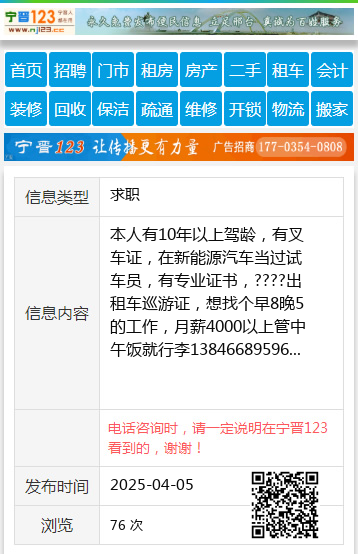 本人有10年以上驾龄,有叉车证,在新能源汽车当过试车员,有专业证书,????出租车巡游证,想找个早8晚5的工作,月薪4000以上管中午饭就行李13846689596 【电话咨询时,请一定说明在伊春信息网看到的,谢谢!】 |