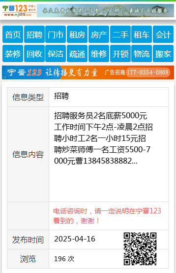招聘服务员2名底薪5000元工作时间下午2点-凌晨2点招聘小时工2名一小时15元招聘炒菜师傅一名工资5500-7000元曹13845838882 【电话咨询时,请一定说明在伊春信息网看到的,谢谢!】 |