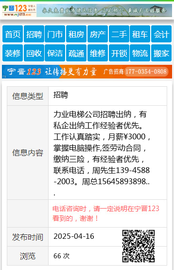 力业电梯公司招聘出纳,有私企出纳工作经验者优先。工作认真踏实,月薪¥3000,掌握电脑操作,签劳动合同,缴纳三险,有经验者优先,联系电话,周先生139-4588-2003。周总15645893898 【电话咨询时,请一定说明在伊春信息网看到的,谢谢!】 |