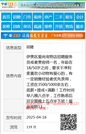 伊美区爱尚宠物店招聘服务员或者美容师一名,年龄在18/50岁之间,要求干净利索喜欢小动物有爱心的,有一定销售经验者优先录用,工资在3500/5000多左右,底薪+提成+满勤!工作时间早八晚六点半,工作熟悉后可交替晚上五点半下班!爱尚宠物13704856963 【电话咨询时,请一定说明在伊春信息网看到的,谢谢!】 |