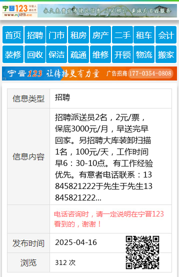 招聘派送员2名,2元/票,保底3000元/月,早送完早回家。另招聘大库装卸扫描1名,100元/天,工作时间早6:30-10点。有工作经验优先。有意者电话联系:13845821222于先生于先生13845821222 【电话咨询时,请一定说明在伊春信息网看到的,谢谢!】 |