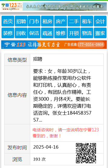 要求:女,年龄30岁以上,能够熟练操作常用办公软件和打印机,认真耐心,有责任心,有团队合作精神。工资3000,月休4天。要能长期稳定的,详情欢迎请打电话咨询。张女士18445835757 【电话咨询时,请一定说明在伊春信息网看到的,谢谢!】 |