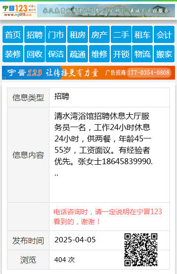 清水湾浴馆招聘休息大厅服务员一名,工作24小时休息24小时,供两餐,年龄45一55岁,工资面议。有经验者优先。张女士18645839990 【电话咨询时,请一定说明在伊春信息网看到的,谢谢!】 |