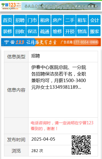 伊春中心医院总院、一分院各招聘保洁员若干名,全职兼职均可,月薪1500-3400元孙女士13349381189