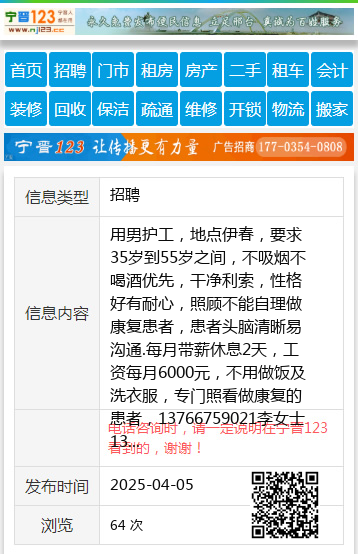用男护工,地点伊春,要求35岁到55岁之间,不吸烟不喝酒优先,干净利索,性格好有耐心,照顾不能自理做康复患者,患者头脑清晰易沟通.每月带薪休息2天,工资每月6000元,不用做饭及洗衣服,专门照看做康复的患者,13766759021李女士13766759021