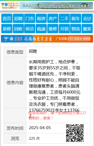 长期用男护工,地点伊春,要求35岁到55岁之间,不吸烟不喝酒优先,干净利索,性格好有耐心,照顾不能自理做康复患者,患者头脑清晰易沟通,工资每月6000元,专业护工勿扰,不用做饭及洗衣服,专门照看患者,13766759021李女士13766759021