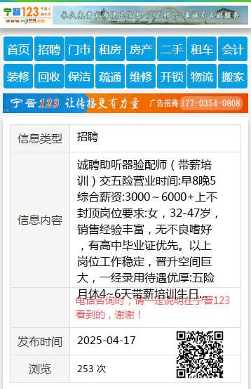 诚聘助听器验配师(带薪培训)交五险营业时间:早8晚5综合薪资:3000~6000+上不封顶岗位要求:女,32-47岁,销售经验丰富,无不良嗜好,有高中毕业证优先。以上岗位工作稳定,晋升空间巨大,一经录用待遇优厚:五险月休4~6天带薪培训生日红包节日福利团建员工旅游等等赵老师18845862016