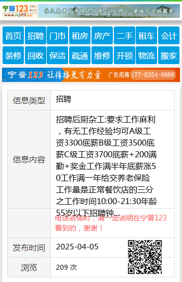 招聘后厨杂工:要求工作麻利,有无工作经验均可A级工资3300底薪B级工资3500底薪C级工资3700底薪+200满勤+奖金工作满半年底薪涨50工作满一年给交养老保险工作量是正常餐饮店的三分之工作时间10:00-21:30年龄55岁以下招聘钟点服务员若干A级工资1800底薪B级工资2000底薪C级工资2200底薪+200满勤+奖金金女士17645597576 【电话咨询时,请一定说明在伊春信息网看到的,谢谢!】 |