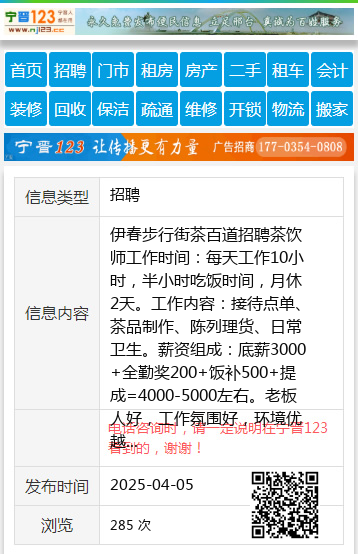 伊春步行街茶百道招聘茶饮师工作时间:每天工作10小时,半小时吃饭时间,月休2天。工作内容:接待点单、茶品制作、陈列理货、日常卫生。薪资组成:底薪3000+全勤奖200+饭补500+提成=4000-5000左右。老板人好,工作氛围好,环境优越。王先生18604586618 【电话咨询时,请一定说明在伊春信息网看到的,谢谢!】 |